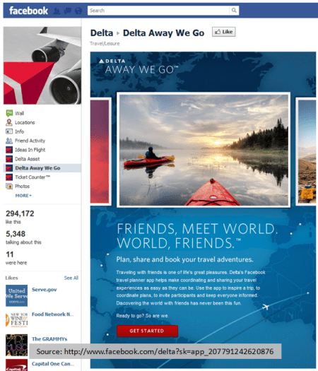 As pointed out in the Rise of Social Commerce, Delta’s Ticket Window (now morphed to Ticket Counter) on allows for friends and family to share group travel events via their Away We Go Facebook travel planner app. Delta Assist and Ideas in Flight provide other ways to connect or find help through Facebook. (Wilson, 2010)