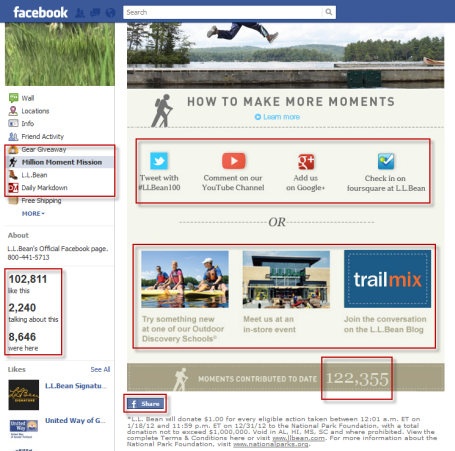 By contrast, mail order and Internet powerhouse LL Bean’s uses multiple Facebook pages and many options for sticky conversations.